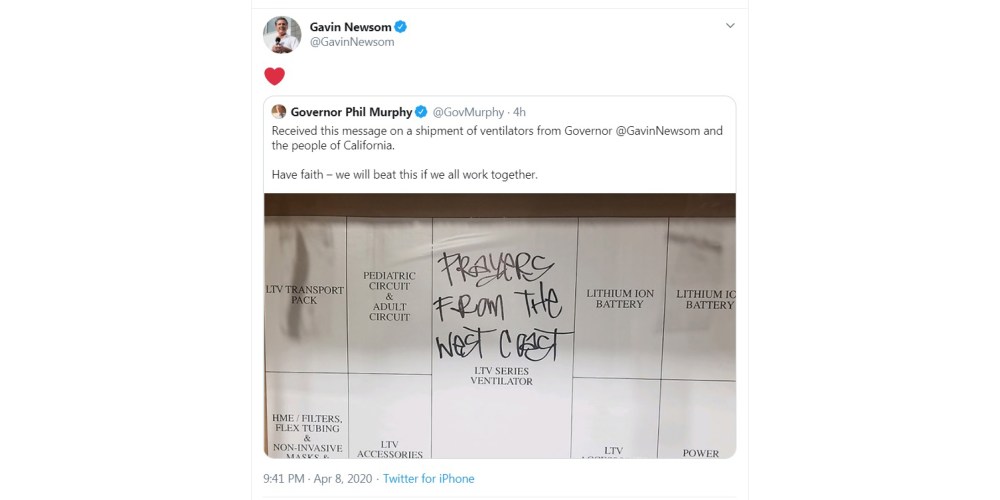 @GovMurphy Received this message on a shipment of ventilators from Governor @GavinNewsom and the people of California. Have faith – we will beat this if we all work together.