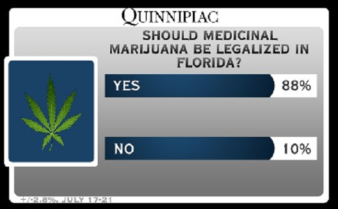“Forget the stereotypes of stodgy old folks living out their golden years playing canasta and golf,” said Peter Brown, assistant director of the Quinnipiac University poll. “Almost nine-in-ten Floridians favor legalizing medical marijuana and a small majority says adults should be able to possess small amounts of the drug for recreational purposes.”