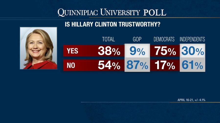 “There’s this concern about whether or not we can trust her, whether or not she’s going to be honest,” Former RNC Michael Steele told Hardball, echoing the findings of a new Quinnipiac poll from Thursday which finds that 38% of the public views Hillary Clinton as trustworthy while 54% do not.