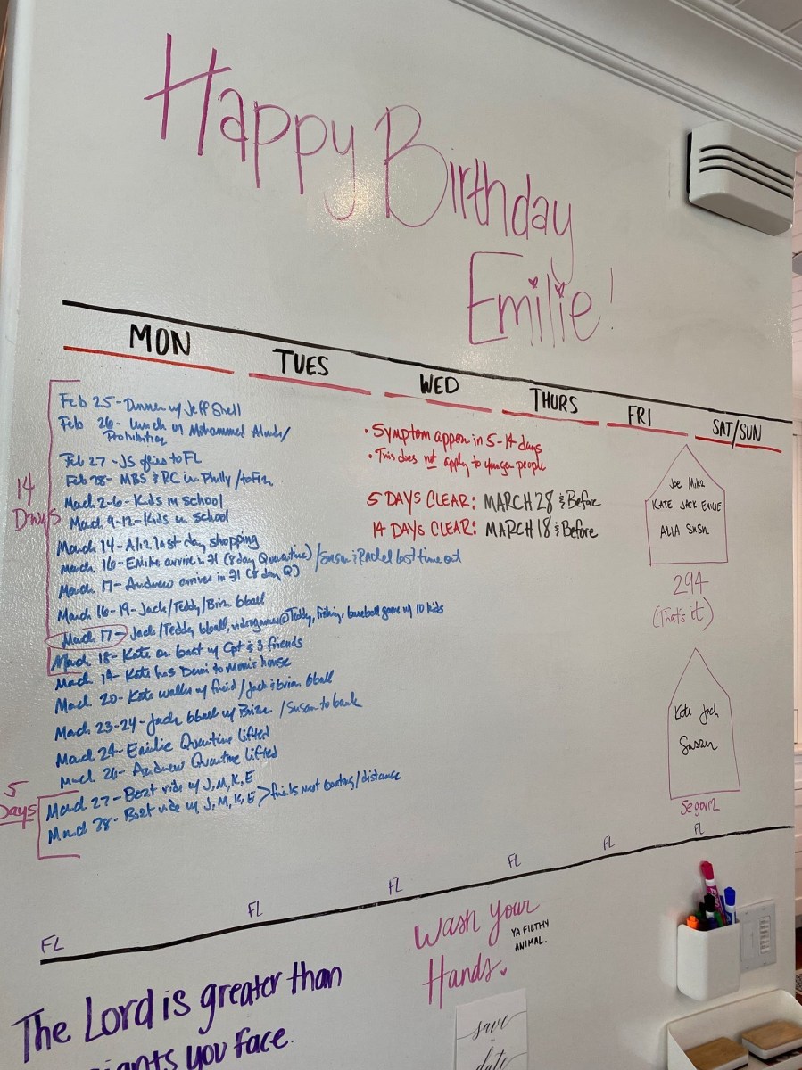 “Now I’m putting in long work days every day but from my home, which is my happy and safe place,” she said. Along with husband Christopher, son Dylan, 17, and daughter Emma, 14, “we’re staying in the house, except for our daily walks (me) or runs (everyone else), and eating dinner together every night. Being with my family nurtures and sustains me.”