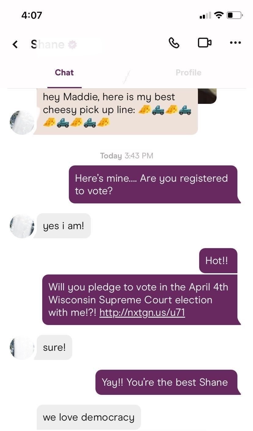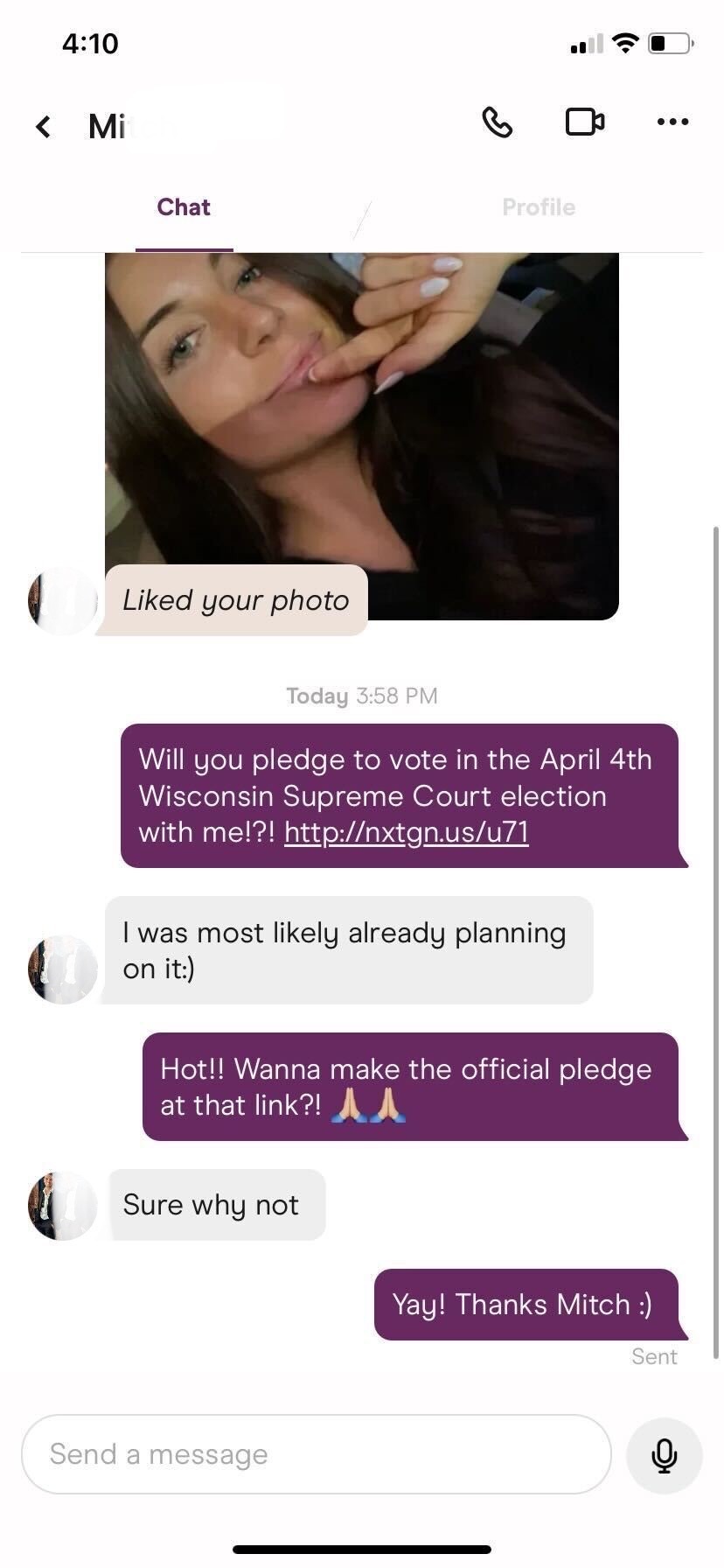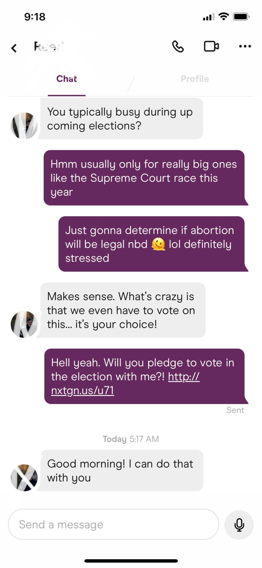 After establishing a friendly relationship on a dating app, NextGen volunteers’ goal was to send the potential voter information on where they could pledge to vote, their polling location and details on how to check their voter registration status.