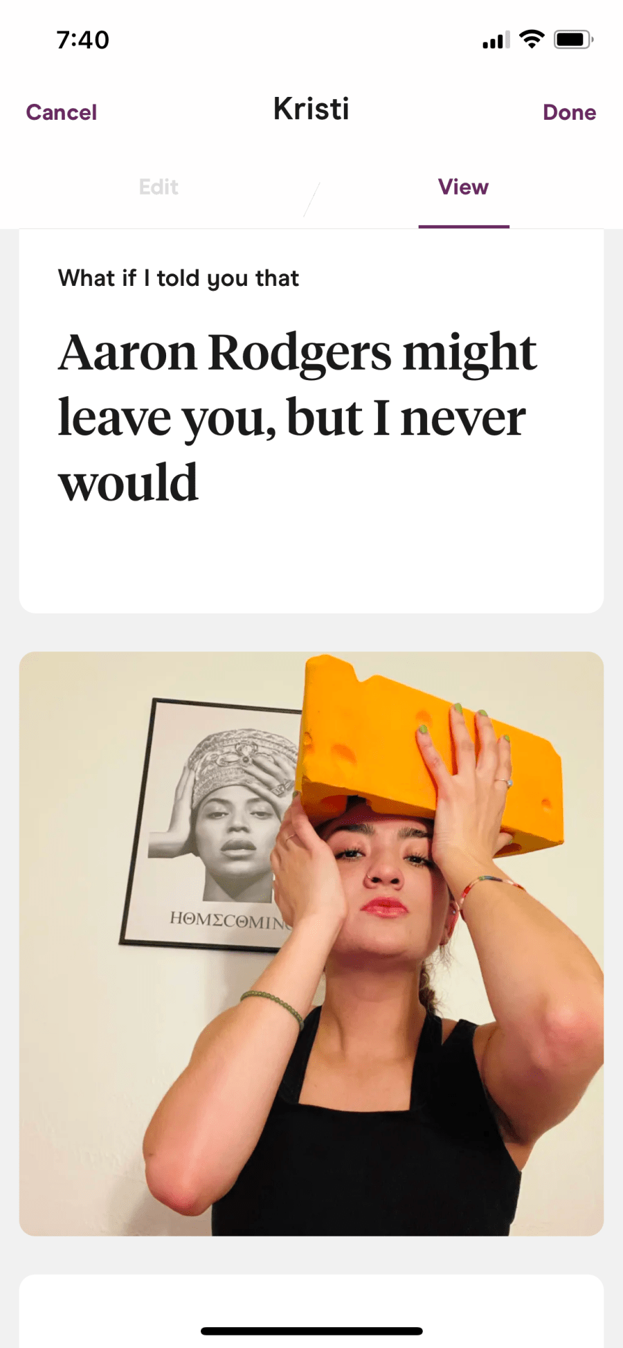 NextGen volunteers also brainstormed catchy profile prompts. For example, Johnston wrote, “What if I told you that Aaron Rogers might leave you? But I never would” — a cheeky nod to the Green Packers quarterbacks’ decision to leave for the New York Jets.