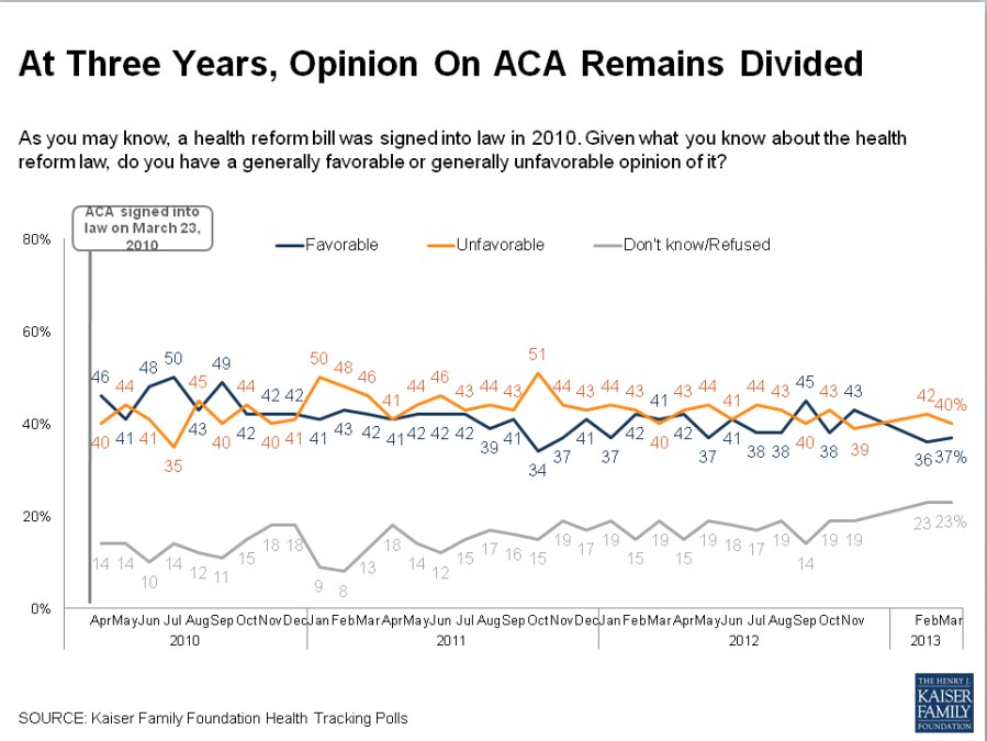 If you like daft ironies, here’s one to chew on today. It was three years ago this week that President Obama signed the greatest piece of social-justice legislation this country has seen in decades. Since its enactment on March 23, 2010, the Affordable Care Act has curbed the health insurance industry’s worst abuses, placed basic coverage within reach for a generation of young adults, and made birth control more accessible to reproductive-age women. Within months, the act will extend health coverage to millions of uninsured Americans by expanding Medicaid and spawning a new market for individual plans. And how are Americans marking the occasion? We’re achieving near-record levels of hostility toward the whole enterprise.