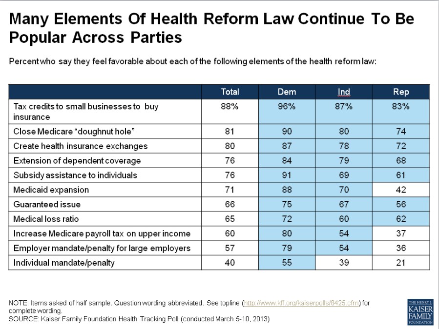 But here’s the catch. People may dislike “the health reform law” when asked about it that way, but their negative views are rooted largely in ignorance. Strong majorities favor most of the law’s key provisions. Two-thirds favor the so-called guaranteed issue, which bars discrimination against people with pre-existing conditions. More than 70% support expanding Medicaid to cover people living below 138% of the poverty level. Some 76% like the rule that allows kids to stay on their parents’ plans through age 25, and even higher proportions favor health insurance exchanges, better drug coverage for Medicare participants, and tax credits to help small businesses sponsor health plans for their employees (chart). All told, the public favors 10 of Obamacare’s 11 key provisions, and Republicans favor seven of the 11. The only feature lacking majority support is the so-called individual mandate, which requires everyone to get some kind of coverage (since everyone will eventually need care). That rule―a Republican idea that Obama borrowed in an early attempt at bipartisanship―was upheld by the Supreme Court last summer.