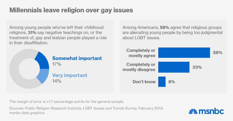 A full 31% of young people (ages 18 to 33) who left organized religion said “negative teachings” or “negative treatment” of gay people was a “somewhat important” or “very important” factor in their departure, as surveyed by the Public Religion Research Institute.