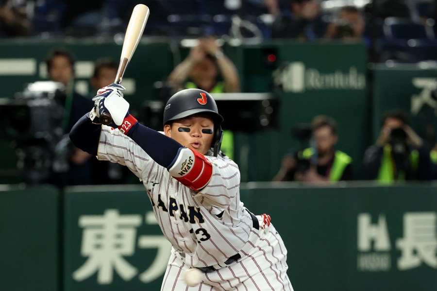 Shota Morishita of Team Japan avoids a pitch in the eighth inning during his team’s game against Australia during the 2026 World Baseball Classic yesterday in Tokyo.