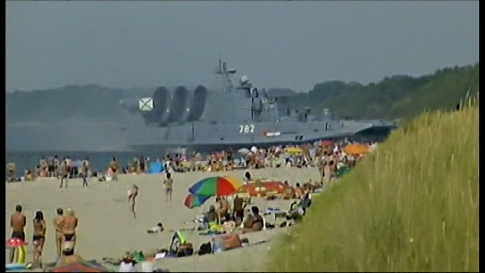 Massive military hovercraft lands on very crowded beach