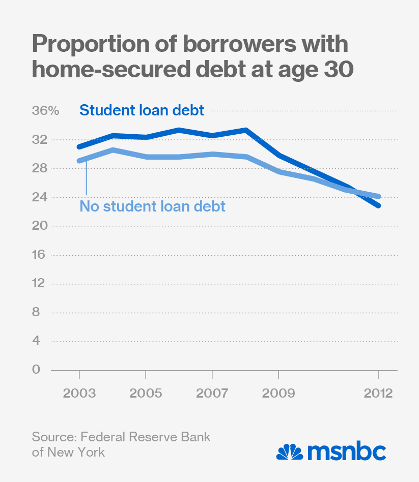The returns on such investment have been slower to come by since the housing bust. Young people with student debt actually used to be more likely to buy homes, as they were likely to be more highly educated and in higher paying jobs. In recent years, the opposite has held true: “Now, for the first time in at least ten years, 30-year-olds with no history of student loans are more likely to have home-secured debt than those with a history of student loans,” the New York Federal Reserve bank said in a 2013 study. A similar trend holds true for auto loans.