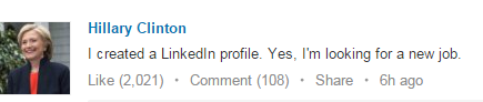 Also on Thursday, Clinton launched her profile on another social network, LinkedIn, where the focus is more on professional networking, business connections and job searching. Clinton’s profile listed her professional resume over the years, starting with her first job as a lawyer in 1973, and ending with her present-day occupation — listed as “2016 presidential candidate.” She then posted a status update saying she’s looking for a new job.