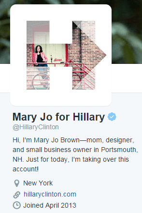 The bio of the Twitter account was also updated to say “Mary Jo for Hillary” instead of Hillary Clinton, and the account featured a photo featuring Mary Jo and Clinton’s “H” campaign logo. The bio also contained a message describing Mary Jo: “Hi, I’m Mary Jo Brown– mom, designer, and small business owner in Portsmouth, NH. Just for today, I’m taking over this account!”