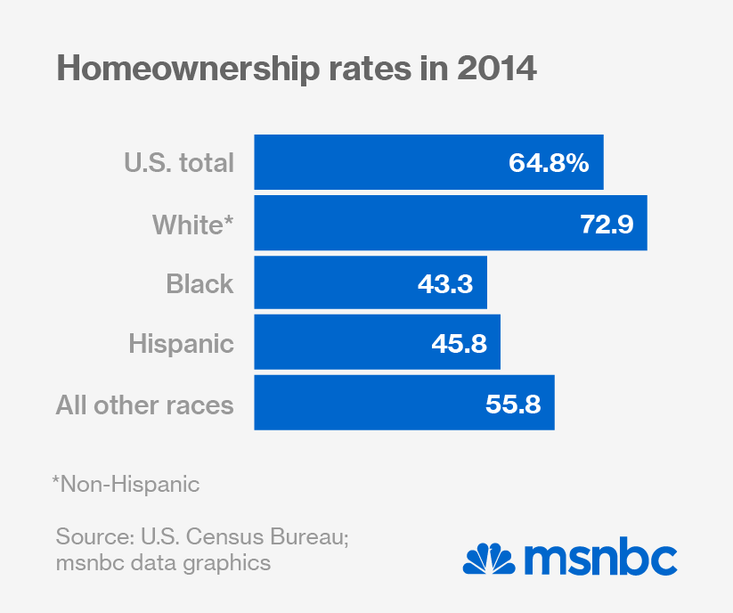 Forty-three percent of African-Americans now own their own homes, according to the Census Bureau, down from 49% in 2004; it’s now at the lowest level since 1995. Among Hispanics, it’s 46%. By comparison, more than 73% of white Americans are currently homeowners. While the worst mortgage practices are now banned, all kinds of other credit has evaporated as well, depressing homeownership rates even further among minority Americans.