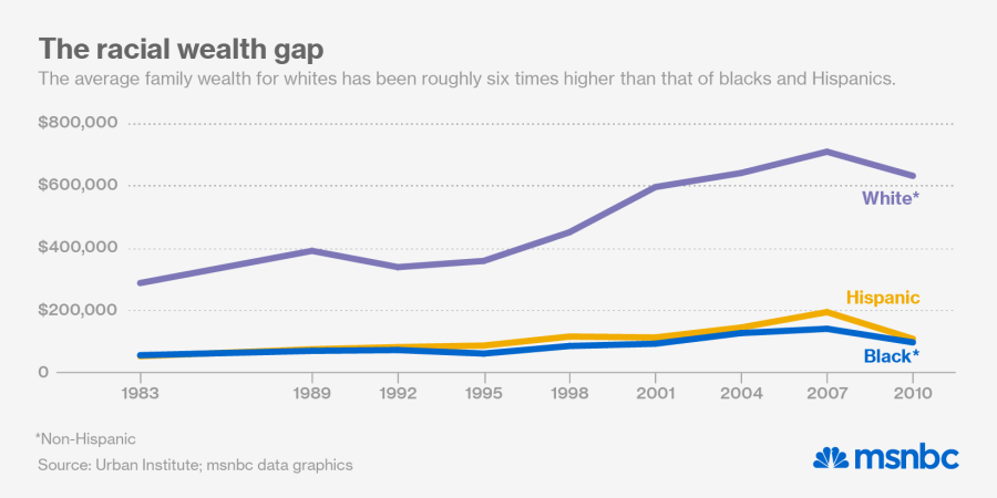 That’s a big reason why the racial wealth gap has grown so large. By 2010, whites had six times the average wealth of blacks and Hispanics, according to the Urban Institute—far greater than the 2:1 income gap between the groups. The Pew Research Group, drawing on different data, estimates that the median white household has twenty times the wealth of a black household.