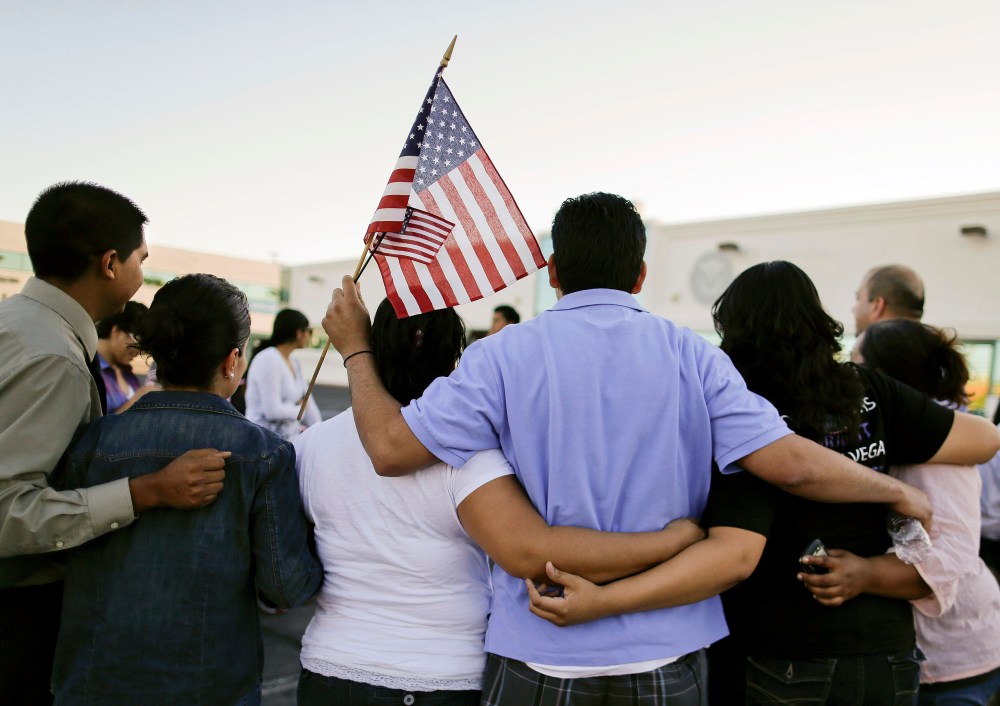 People gather for a photo outside the Immigration and Customs Enforcement offices during an immigration vigil, on April 10, 2013, in Las Vegas.AP