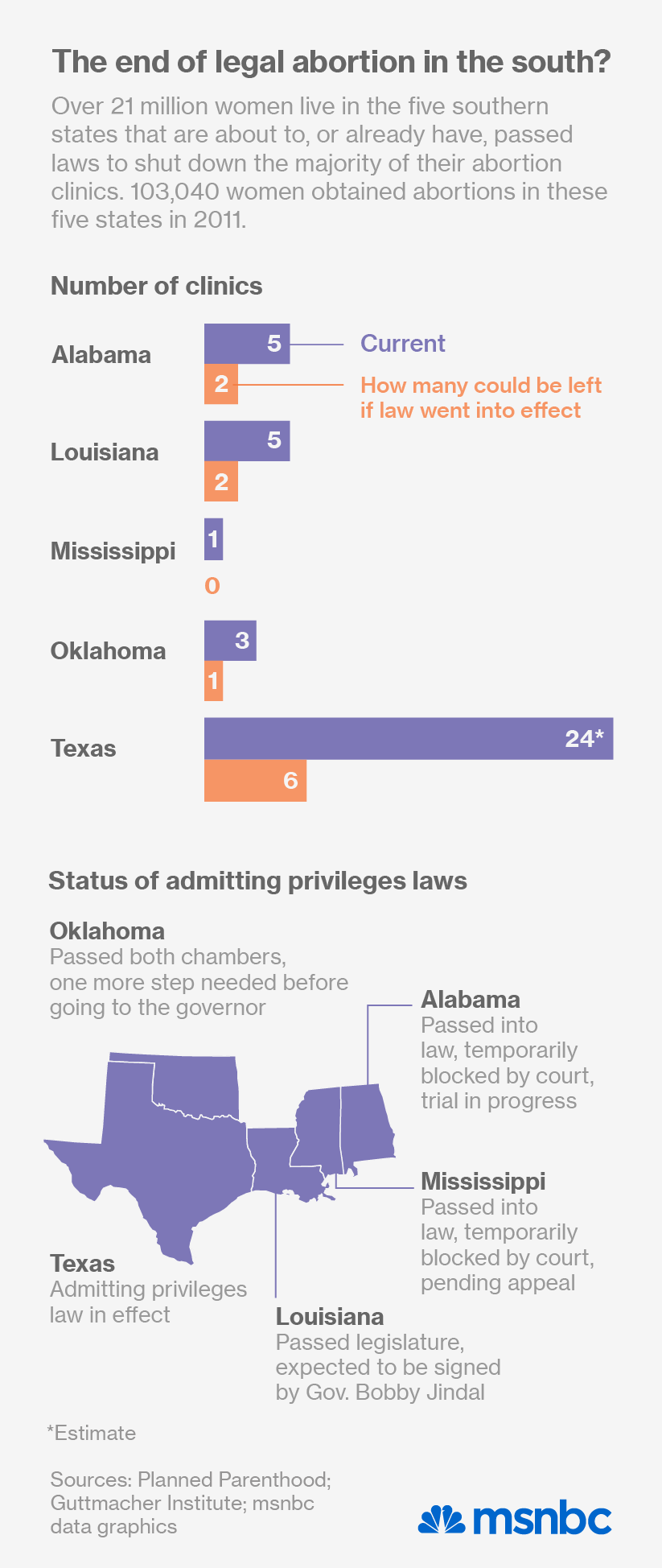 The clinics would not be shutting for lack of demand. According to the Guttmacher Institute, in 2011, women in those five contiguous states – Mississippi, Alabama, Texas, Louisiana, and Oklahoma – had a total of 103,040 legal abortions.