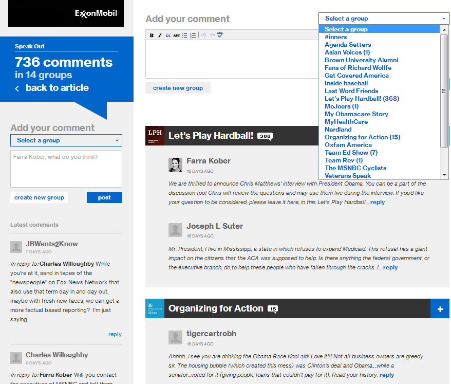 Groups are key to elevated conversation and constructive dialogue on the new msnbc.com. Comments are organized by groups, allowing users to start discussions with the people, shows, or organizations they are most interested in connecting with. Users can create their own group and invite others from both within the msnbc community and their own external social networks.