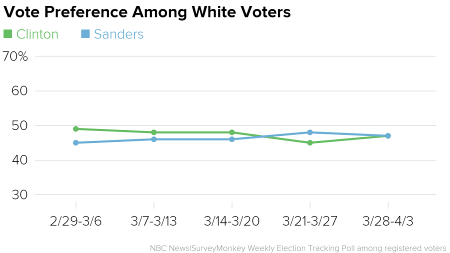 The key to the remaining contests in the presidential primaries is the size of particular groups in individual states as Clinton and Sanders have done very well with distinct segments of the electorate. Our national poll numbers show that while Clinton is clearly ahead in the head-to-head with Sanders, he remains competitive with her with a few key groups in Tuesday’s contest in Wisconsin. Among white voters—who made up 87 percent of the electorate in Wisconsin’s 2008 Democratic primary—Sanders and Clinton are currently tied.