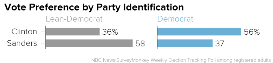 While Sanders is the clear favorite among independents who lean toward the Democratic Party, those who identify solidly as Democrat support Clinton over Sanders by a nearly identical margin—56 percent to 37 percent.
