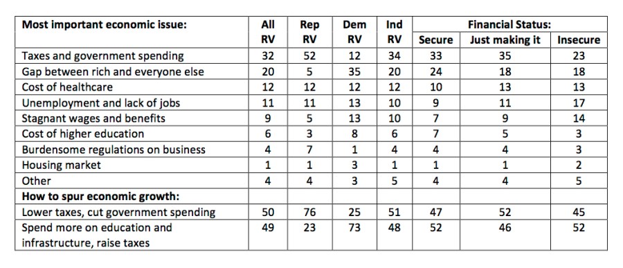 Asked about a list of economic issues facing the country, taxes and government spending were seen as the most important by 32% of voters, followed by the gap between the wealthy and everyone else at 20%. Not surprisingly, party identification separates Americans on these economic issues, even more so than one’s financial status. A slim majority of Republican voters ranked taxes and government spending as the most important problem compared to a third of independent and about 1 in 8 Democratic voters. Democratic voters were more divided on economic issues. The gap between the rich and everyone else was a top priority for 35%, but unemployment, stagnant wages, the cost of healthcare, and taxes were important to about 1 in 8 Democrats each.