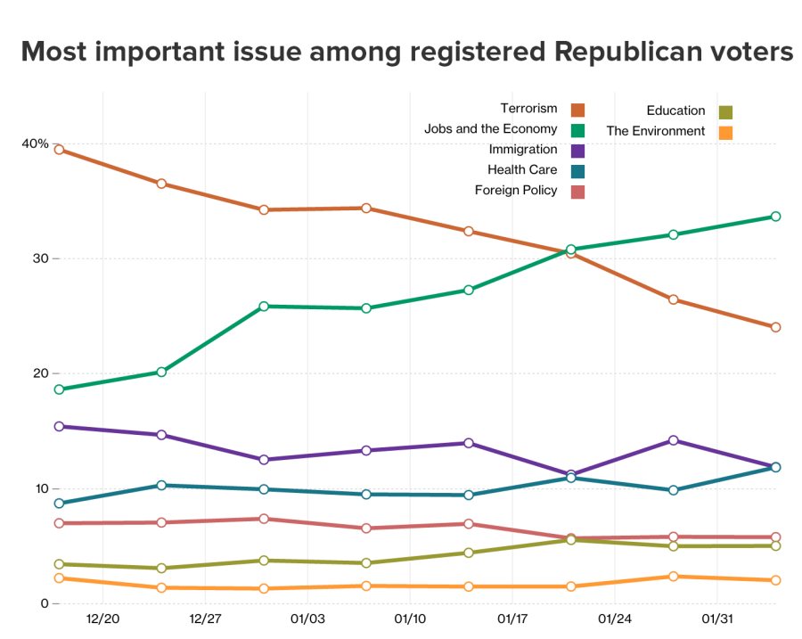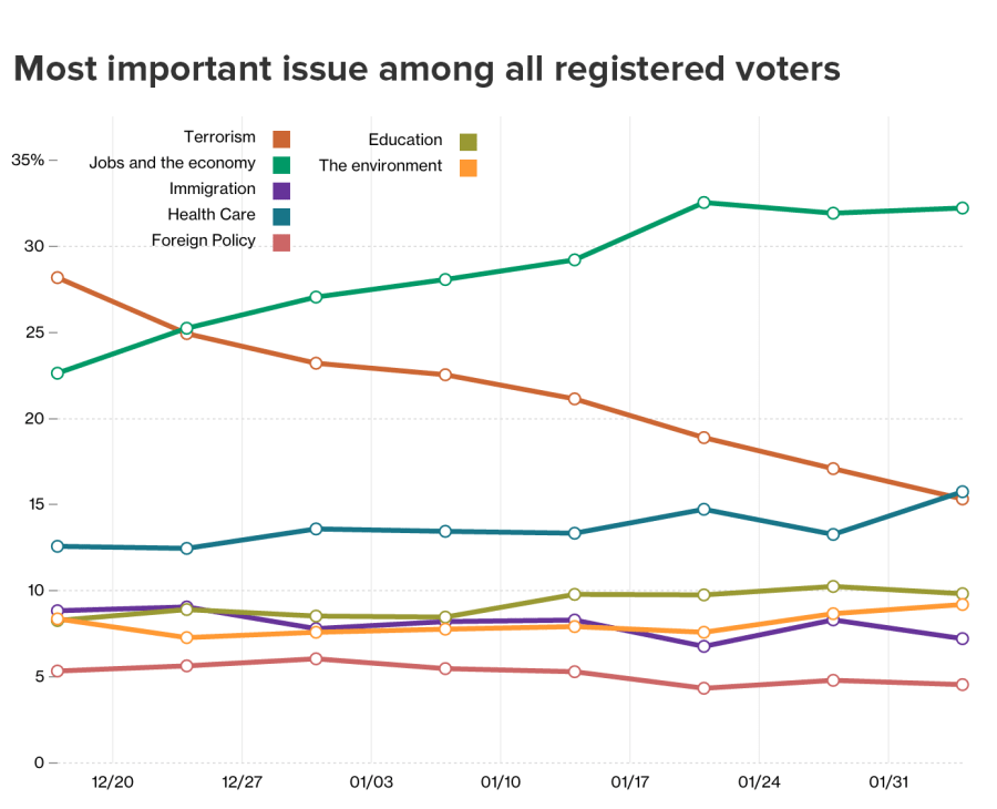 Results from the most recent NBC News|SurveyMonkey Weekly Election Tracking Poll conducted online from February 1 to February 7 suggest that the importance of terrorism has fallen considerably. Nearly a third — 32 percent — of voters now state that jobs and the economy is the issue most important to them, compared to the 15 percent who say terrorism.