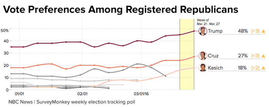 With just three candidates left in the Republican primary race, Donald Trump now holds 48 percent support of registered Republicans and Republican-leaners, according to the NBC News|SurveyMonkey Weekly Election Tracking poll. This is more than 20 points higher than his second-place competitor, Ted Cruz—who now enjoys 27 percent support. John Kasich got a boost of 2 points this week and holds third place with 18 percent support.