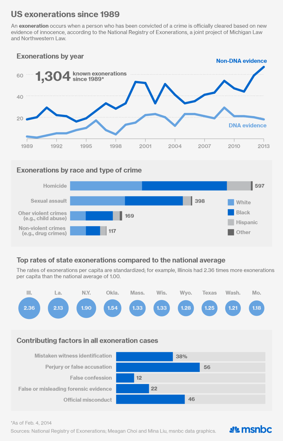 A new study shows that a record 87 people were exonerated in 2013. Since 1989, the National Registry of Exonerations has tracked more than 1,300 people who were convicted for a crime and later released based on evidence of innocence. Perjury or false accusation contribute to more than half of U.S. exoneration cases, which are most frequently homicides.