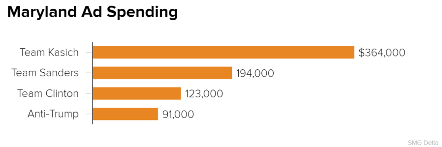 By comparison, the Clinton campaign has spent $2.4 million in those same states. (Delaware is also holding a primary on Tuesday, but it shares a media market with Pennsylvania – so it doesn’t show up in the SMG Delta numbers.)