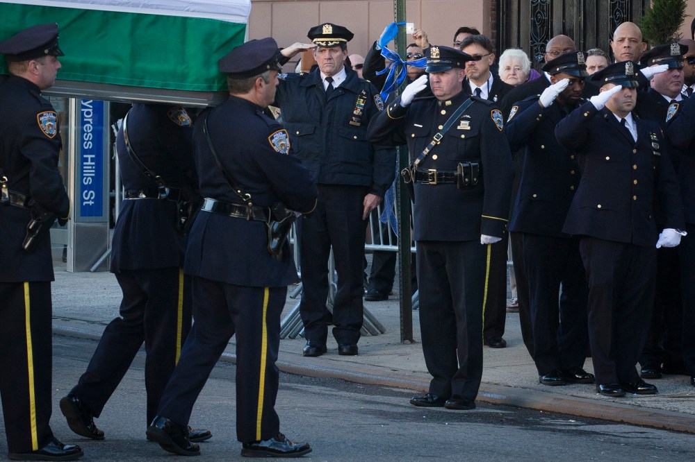 The casket of New York Police Department officer Rafael Ramos arrives to his wake at Christ Tabernacle Church in the Glendale section of Queens, where he was member, on Dec. 26, 2014, in New York.AP