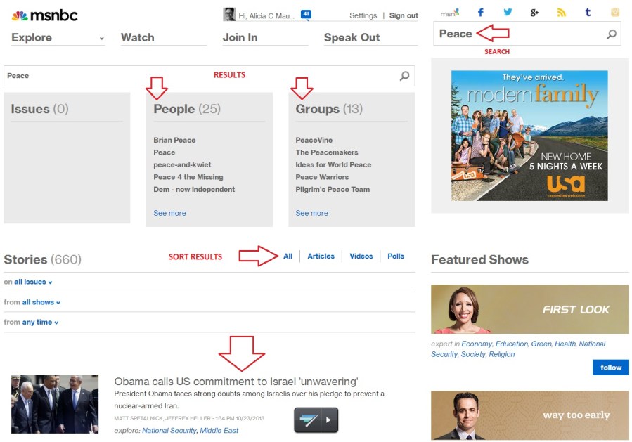 Once you type in what you’re looking for and hit enter, there are several categories of results: issues, people, groups, and stories. In the example below, we searched “peace” and the results were as follows: