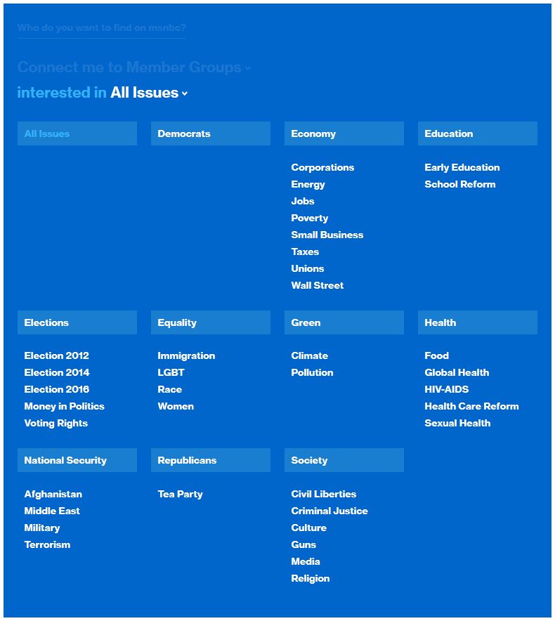 A) Anyone—This selection will show you msnbc community members like yourself, show hosts, member groups, activist groups and organizations, as well as msnbc staff
