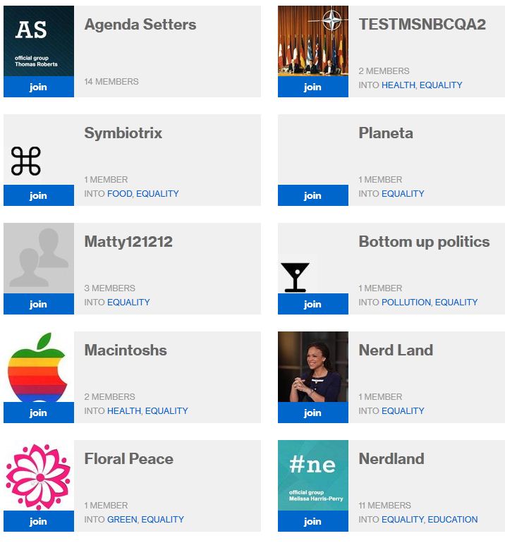 F) Member Groups—These are groups created by msnbc community members like you! Many of them have open membership and you can just click “join.” Others that are more specifically tailored have closed membership and you can click “apply.” An administrator from that group will then determine whether or not to grant you admission.