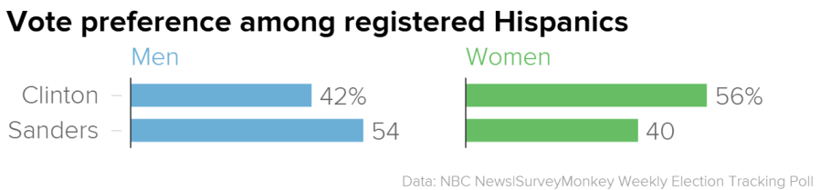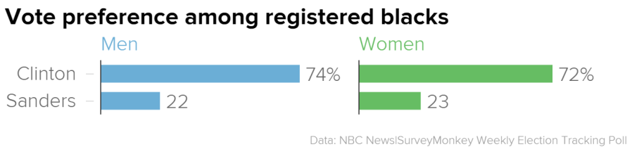 Results from our latest week of polling show that Sanders remains competitive with Clinton among registered Democratic and Democratic-leaning men overall—46 percent for Sanders and 49 percent for Clinton. The margin among women, however, more decidedly favors Clinton. Women favor Clinton by nearly 20 points—57 percent to 37 percent.