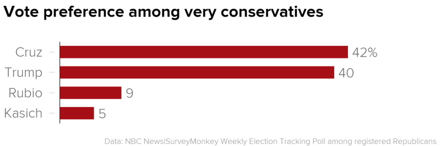 Republicans who describe themselves as very conservative, however, support Cruz over Trump, 42 percent to 40 percent. That margin is smaller than last week’s tracking poll, which showed Cruz winning 36 percent of those who identify as very conservative and Trump getting support from 31 percent of that group.