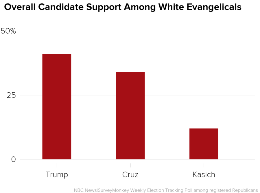 One of the biggest surprises in the Republican primary so far has been the strong support Trump has received from white evangelical Christians. In this week’s poll, Trump leads Cruz among overall white evangelicals by 7 points — 41 percent to 34 percent. This number, however, masks the fact that there are big differences among evangelical voters. If we divided white evangelicals into two groups – those who attend church more than once a week and those who do not – we find that Cruz is the favorite over Trump by a 15-point margin among those who attend church the most.