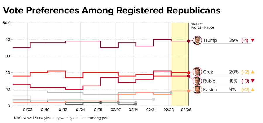 Donald Trump, Ted Cruz and Marco Rubio’s national numbers have remained relatively stable, though Cruz has moved into second place.