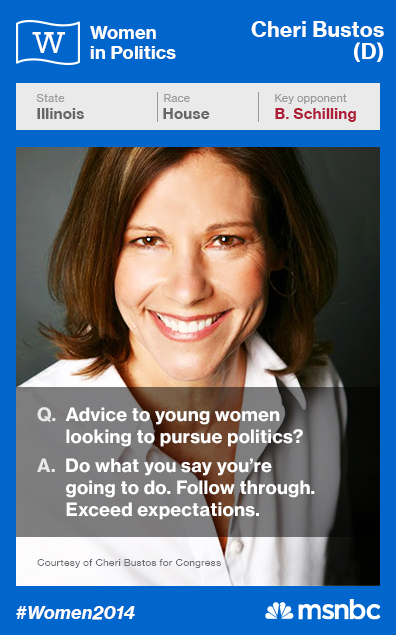 Here’s the deal: Bustos is vying to keep her seat in Illinois’ 17th District, facing Republican Bobby Schilling — a former congressman who she beat in 2012. Bustos — the first woman elected in the District — has supported raising the minimum wage earlier this year and has campaigned to get health care and good-paying jobs for veterans. Bustos is an original cosponsor of the Paycheck Fairness Act.