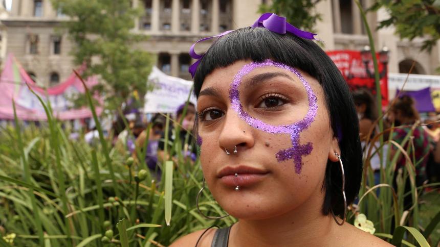 Image: Close-up for a woman at a protest.
