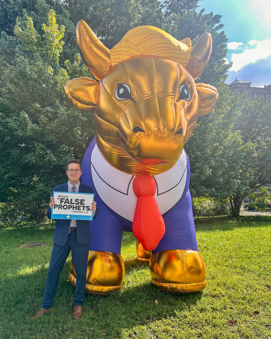 The Trump Golden Calf sends the unmistakable message that Christians worshipping Trump is idolatrous, and we rebuke our siblings in Christ who are providing spiritual cover for Trump’s authoritarian destruction of American democracy. Trump shows no evidence of personal piety or of an attempt to follow Jesus Christ — recall when he said he never had to ask God for forgiveness — and has made it a priority to aid the wealthy and attack the most vulnerable in our society. He exhibits the polar opposite of Christian social ethics.