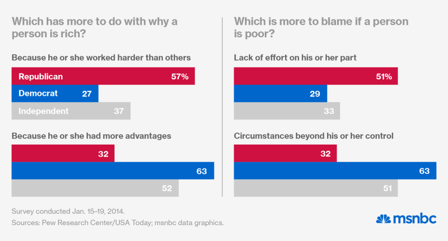 The new Pew poll finds that 51% of Republicans agreed that “lack of effort on his or her part” was the primary reason that a poor person would find his or herself in poverty, while only 32% put the blame on “circumstances beyond his or her control.” Conversely, Democrats are more likely to blame circumstances rather than a lack of effort, 63% to 29%. Independent voters track more closely to Democrats on this issue as well, with 51% blaming circumstances and 33% blaming laziness for poverty.