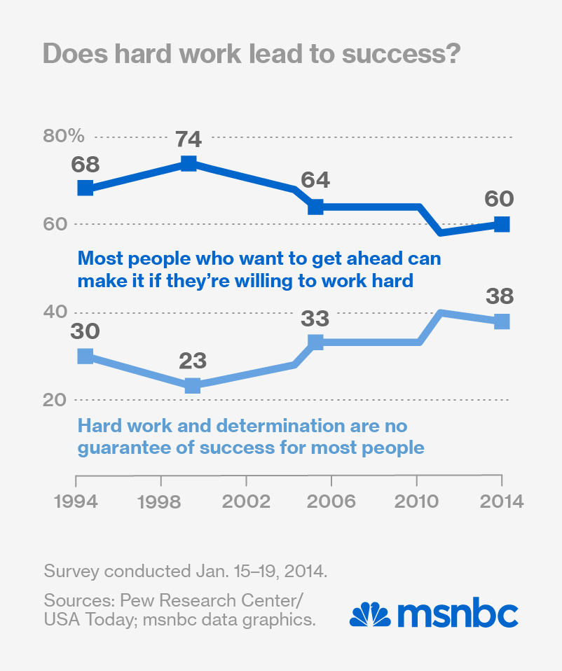 When polled as a whole, Americans are more pessimistic about what many the American Dream. When asked if most people can get ahead in life with hard work and perseverance, 60% said yes and 38% said no. While optimism on this issue has grown slightly (by 2%) since 2012, it’s still far lower than in 1999, when 74% of those polled said yes.