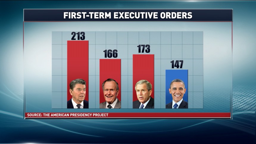 The president’s assertion that he has taken “disciplined and sparing” approach to executive action is grounded in cold hard data. MaddowBlog’s Steve Benen used data from the American Presidency Project to calculate the annual average of executive orders for all the presidents since the beginning of the 20th century. Obama turns out not just to rank average in comparison to his predecessors. He ranks dead last. The same data shows that presidents have made less use of that particular tool in recent decades, but Obama still has used fewer than any, issuing a mere 168 executive orders in his first five years.