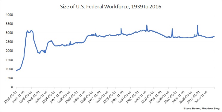 Using data from the Bureau of Labor Statistics, I put together the above chart, showing the trajectory of the federal workforce since 1939, when the government started keeping track. That spike on the left side of the image points to World War II, and those intermittent spikes appearing every 10 years reflect temporary federal hiring for the Census.The image is pretty straightforward: there has been no “dramatic expansion of the federal workforce in recent years.”I’ve seen some suggestion that Spicer lied about this to reporters yesterday, but let’s not jump to conclusions. It’s entirely possible the White House press secretary simply didn’t know what he was talking about when explaining his administration’s new federal policy.But even if this more forgiving interpretation is correct, it raises a related question: if the Trump White House doesn’t know about the size and growth rates of the federal workforce, why is the Trump administration so eager to freeze it?Or put another way, if yesterday’s directive is intended to “counter” a trend that doesn’t exist, maybe the White House’s new policy isn’t necessary?