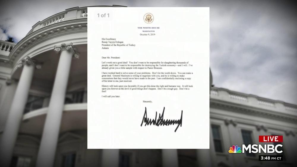 But even if we put aside these relevant details, it’s Erdogan’s response to the correspondence that matters most. On Oct. 6, Trump told Erdogan he would move U.S. troops out of the way, clearing the way for Turkey’s offensive against our allies. On Oct. 9, Trump sent his counterpart a poorly written letter, warning him not to look like “the devil,” “a tough guy,” and “a fool.”