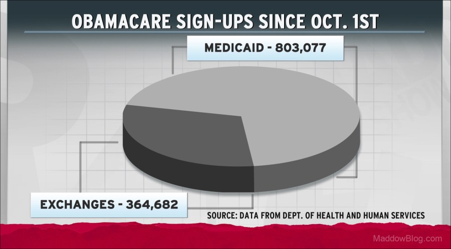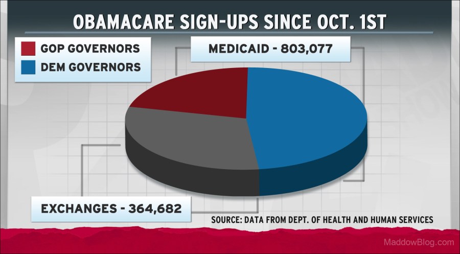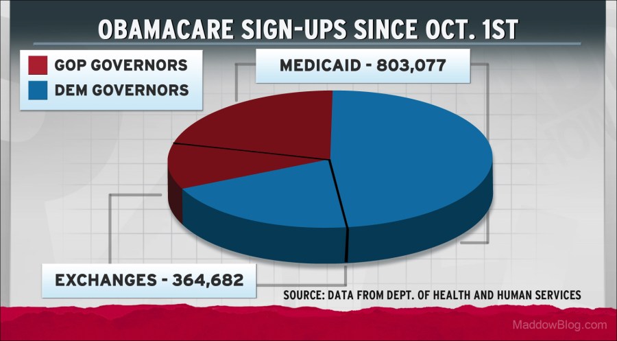 When it comes to signing up for health insurance through the new law, early data show a wide gap between the red and blue states. Last night on the show (video below), producer Mike made a chart based on statistics from this new AP report: