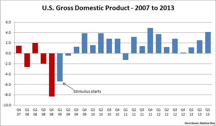 As for the image above, the chart shows GDP numbers by quarter since the Great Recession began. The red columns show the economy under the Bush administration; the blue columns show the economy under the Obama administration.