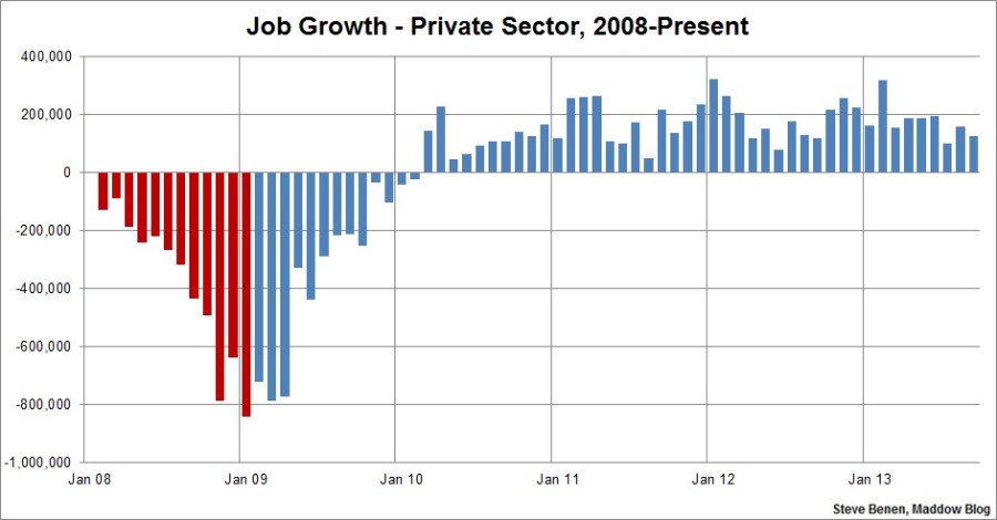 Above you’ll find the chart I run every month, showing monthly job losses since the start of the Great Recession. The image makes a distinction — red columns point to monthly job totals under the Bush administration, while blue columns point to job totals under the Obama administration.