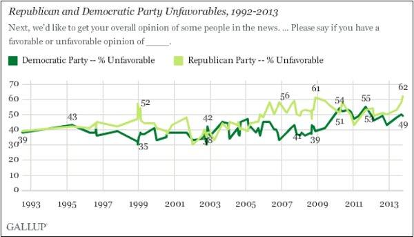This Gallup chart shows the parties’ favorability ratings over the last 21 years, and you’ll notice that sharp drop on the right side of the image. That shows GOP support falling off a cliff.