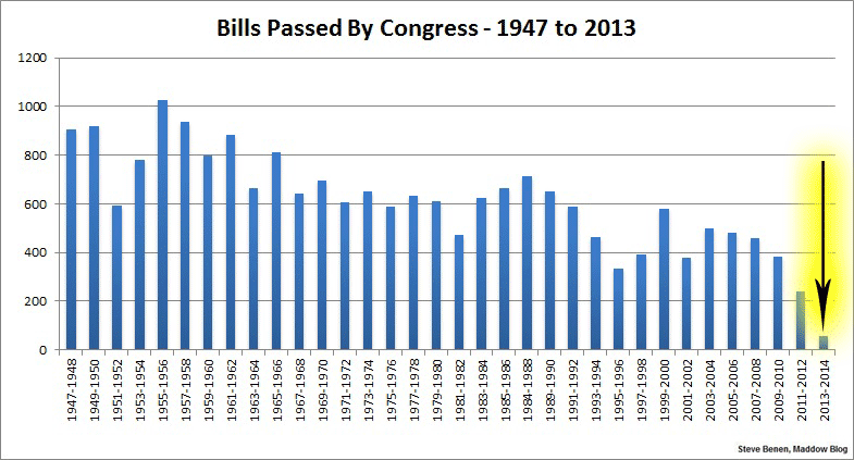 But in the current case, this caveat doesn’t help the current crop of lawmakers — they haven’t been passing good bills, either. On the contrary, the most notable legislative development of 2013 was the Republicans’ decision to shut down the government for reasons they still can’t explain. Meanwhile, routine bills that are ordinarily passed with minimal fuss, such as the farm bill, have languished.