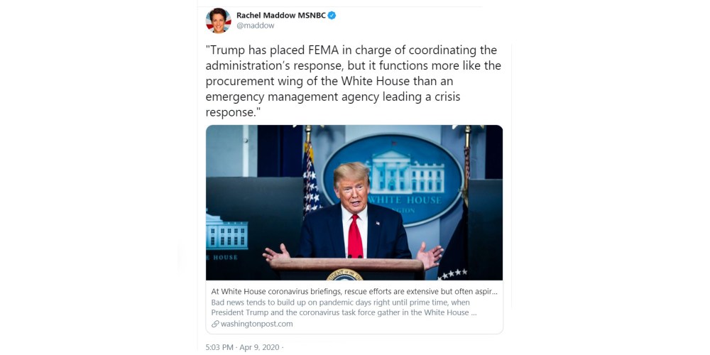 "Trump has placed FEMA in charge of coordinating the administration’s response, but it functions more like the procurement wing of the White House than an emergency management agency leading a crisis response."