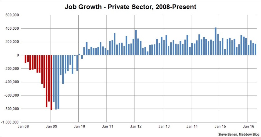 Update: Here’s another chart, this one showing monthly job losses/gains in just the private sector since the start of the Great Recession.
