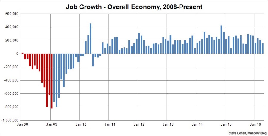 Above you’ll find the chart I run every month, showing monthly job losses since the start of the Great Recession. The image makes a distinction – red columns point to monthly job totals under the Bush administration, while blue columns point to job totals under the Obama administration.